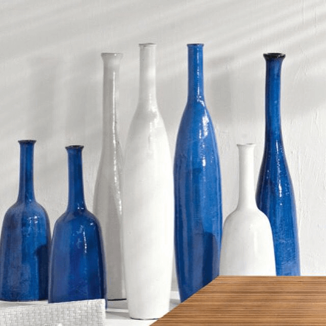 Botella de cerámica color azul, para espacios exteriores e interiores. No recomendable para utilizar con líquidos.